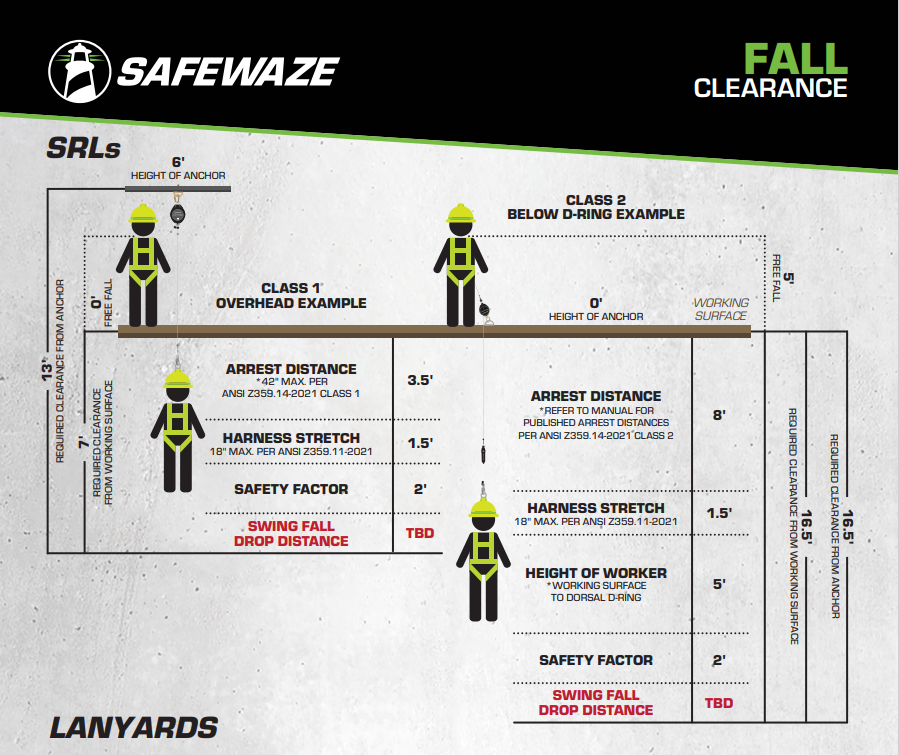 The total clearance required includes the SRL extension, deceleration distance, harness stretch, and the worker’s body length, with an added safety buffer. If the total distance is miscalculated, the worker could strike a lower level before the fall is fully arrested.