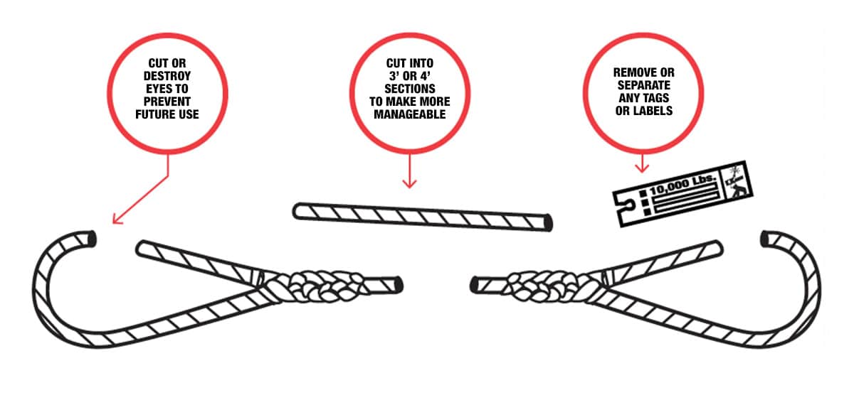 <p>If it’s determined that the synthetic rope sling will be removed from service, we suggest cutting it down into more manageable sizes before discarding. This extra effort will help to accommodate the needs of most recycling facilities that will accept the damaged rope and also help to make sure that it cannot be used any further.</p>