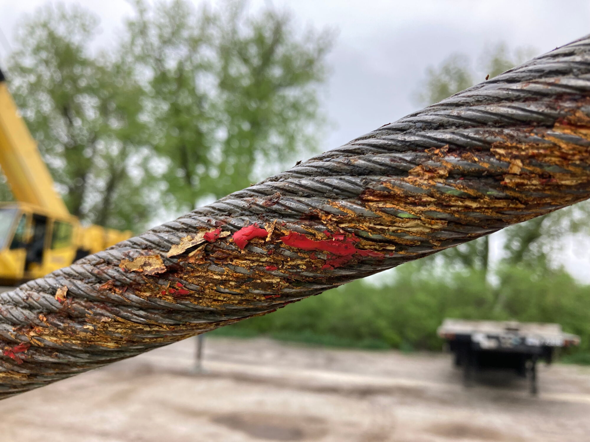 During daily inspections, slowly jog the crane to move different rope sections through inspection points. Visually scan for protruding wire ends, diameter changes, rust, and deformation.